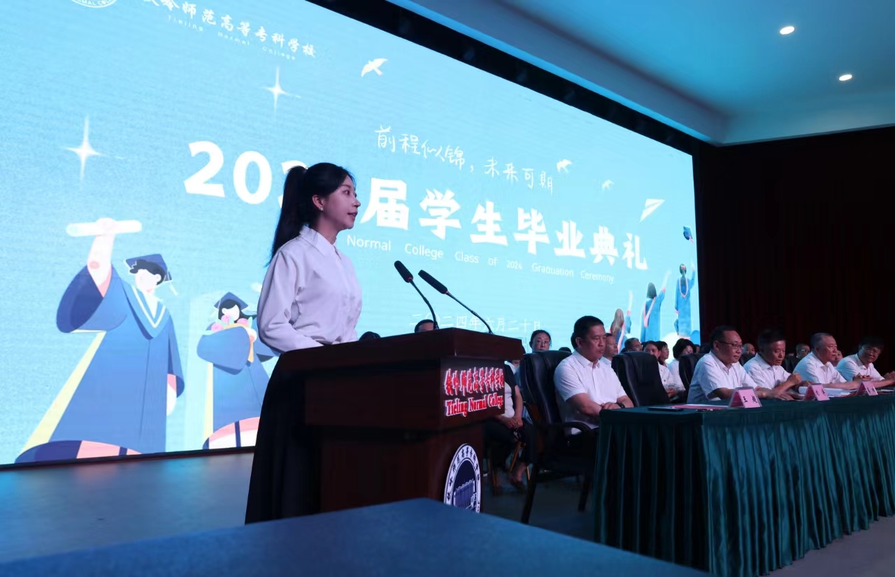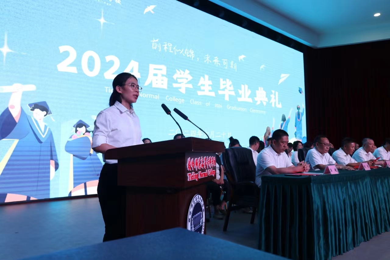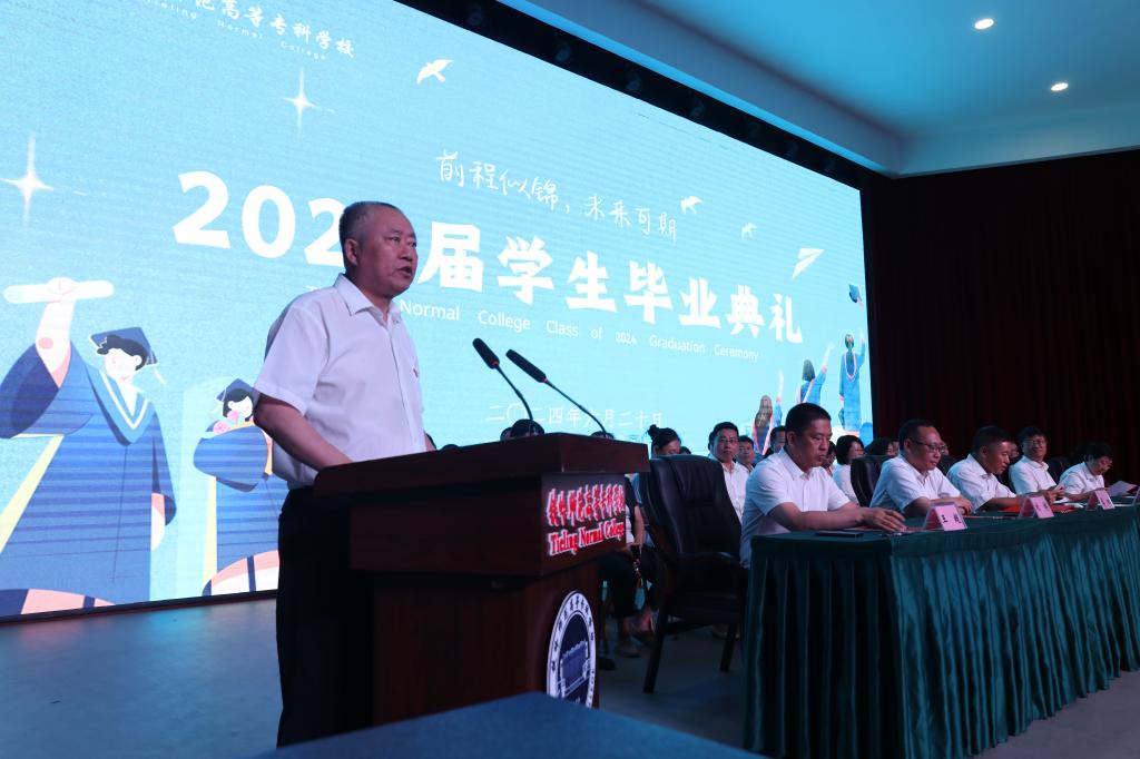 党委书记单向东在典礼上发表致辞。他代表学校向圆满完成学业的2024届1772名毕业生致以最热烈的祝贺!向辛勤培育学生的全体教师和家长朋友们致以崇高的敬意和衷心的感谢!单书记深情回顾了同学们在铁岭师专弥足珍贵的大学时光,他充分肯定了毕业生们在学业、社会服务等方面取得的成绩,并代表师长送给毕业生三个字:“上”——保持积极向上的心态,尽自己最大努力,不负此生;“止”——凡事有度,不忘初心,止是目标的明确,是认真思考后再出发;“正”——心中有正气、为人坦荡荡,守住内心的准则,守住做人的底线。